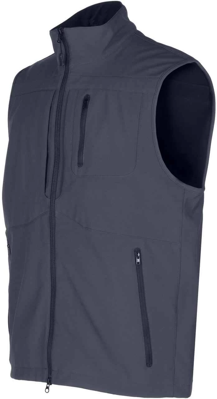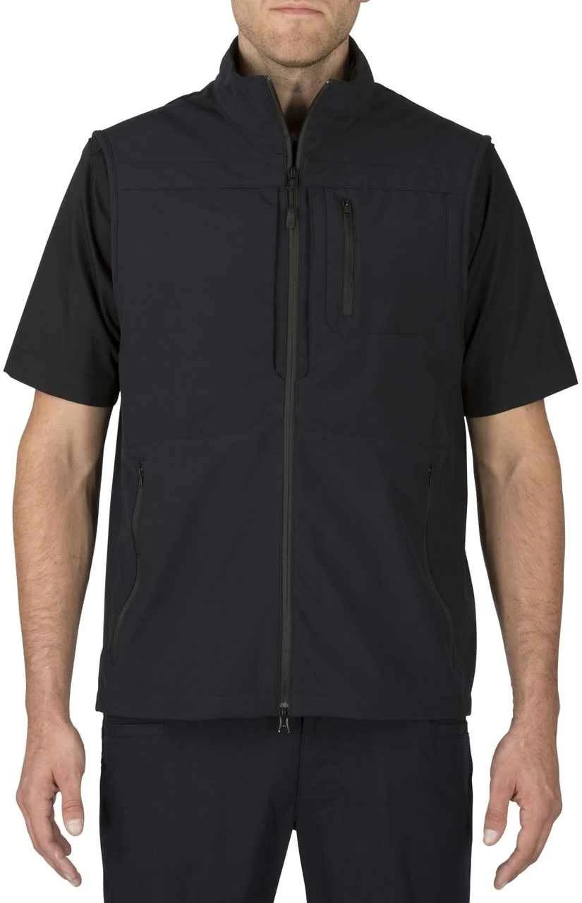 The 5.11 Tactical Covert Vest was engineered for superior tactical utility and wearability while remaining inconspicuous. This vest is crafted from 100% resistant polyester soft-shell fabric for superior protection against wind and rain. Dual zipper pass through pockets provide quick access to a holstered sidearm. There are also hidden document pockets on the chest and the hand warmer pockets have been tricot-lined for extra comfort. The front opening has a two way zippered closure.