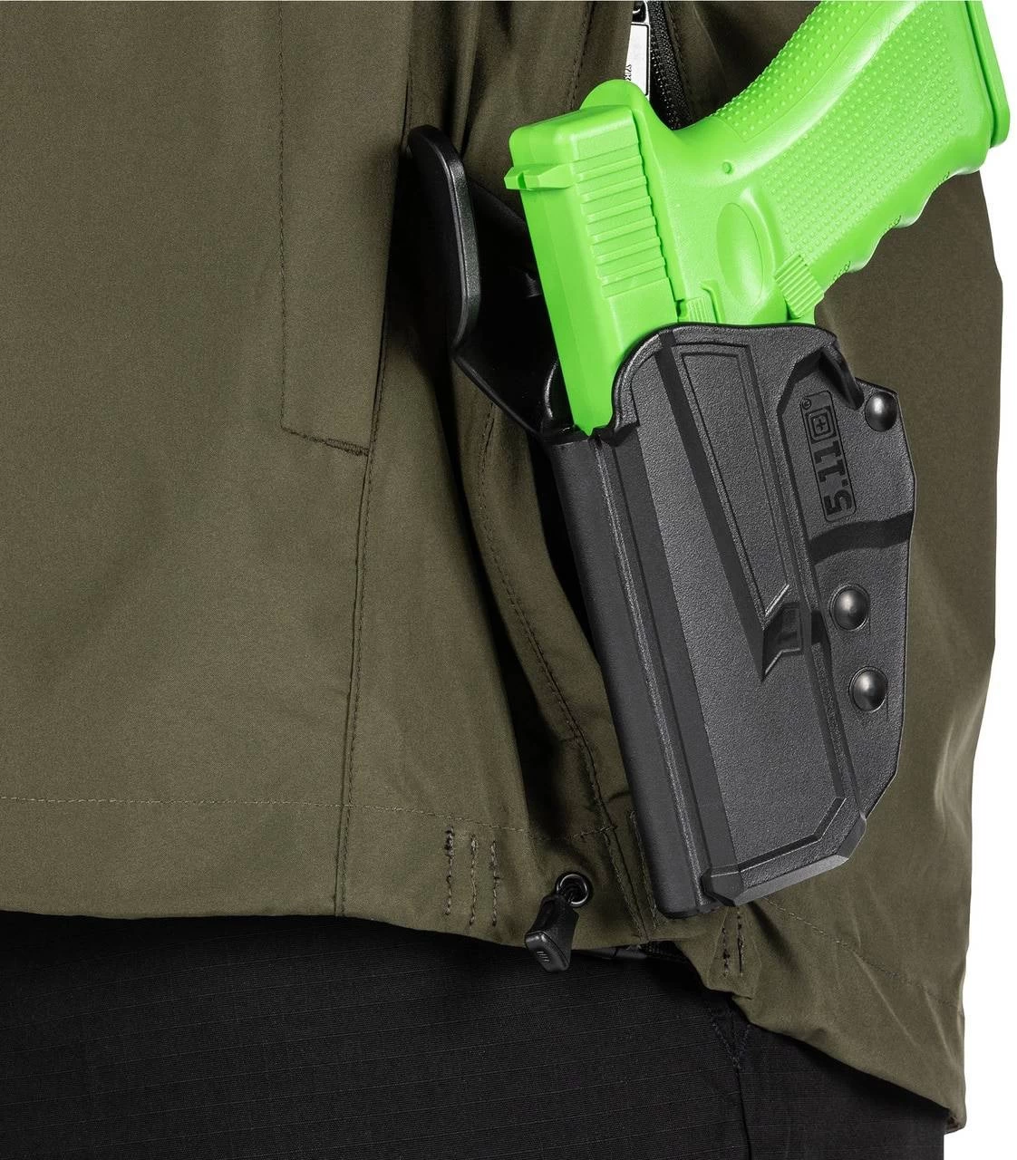 The 5.11 Tactical Men’s Duty Rain Shell is waterproof, breathable, lightweight, and adjustable to keep you dry without making you too hot. Articulated sleeves with an ergonomic fit moves with your arms so there is no constriction and the jacket itself is easy to don and built to maneuver, so the hood will turn with you when you swivel you head. A two-way front zipper is fitted with an external storm flap to prevent leakage, all the seams are sealed, and the hem has an adjustable shock cord system. The sides of this waterproof tactical jacket feature 5.11’s Quixip system for duty belt and sidearm access.