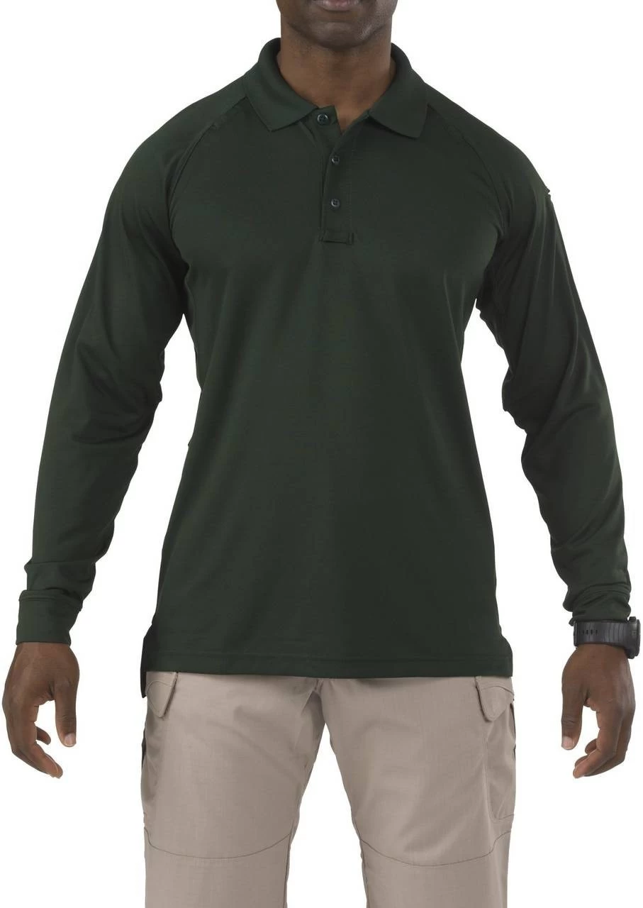 The 5.11 Tactical Long Sleeve Performance Polo Shirt features superior moisture management technology and quick drying characteristics to allow you to operate at peak levels while remaining cool, dry, and comfortable throughout your day. Built from a 6.7 oz. jersey knit polyester fabric, the Performance Polo is snag, shrink, and wrinkle resistant and features a no-roll collar for a clean, professional appearance that lasts all day long. Gusseted sleeves ensure complete freedom of movement while integrated mic clips keep you connected. This polo also has 5.11’s signature pen pockets on the left sleeve for quick convenience.