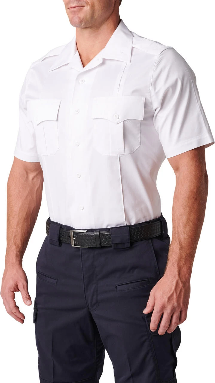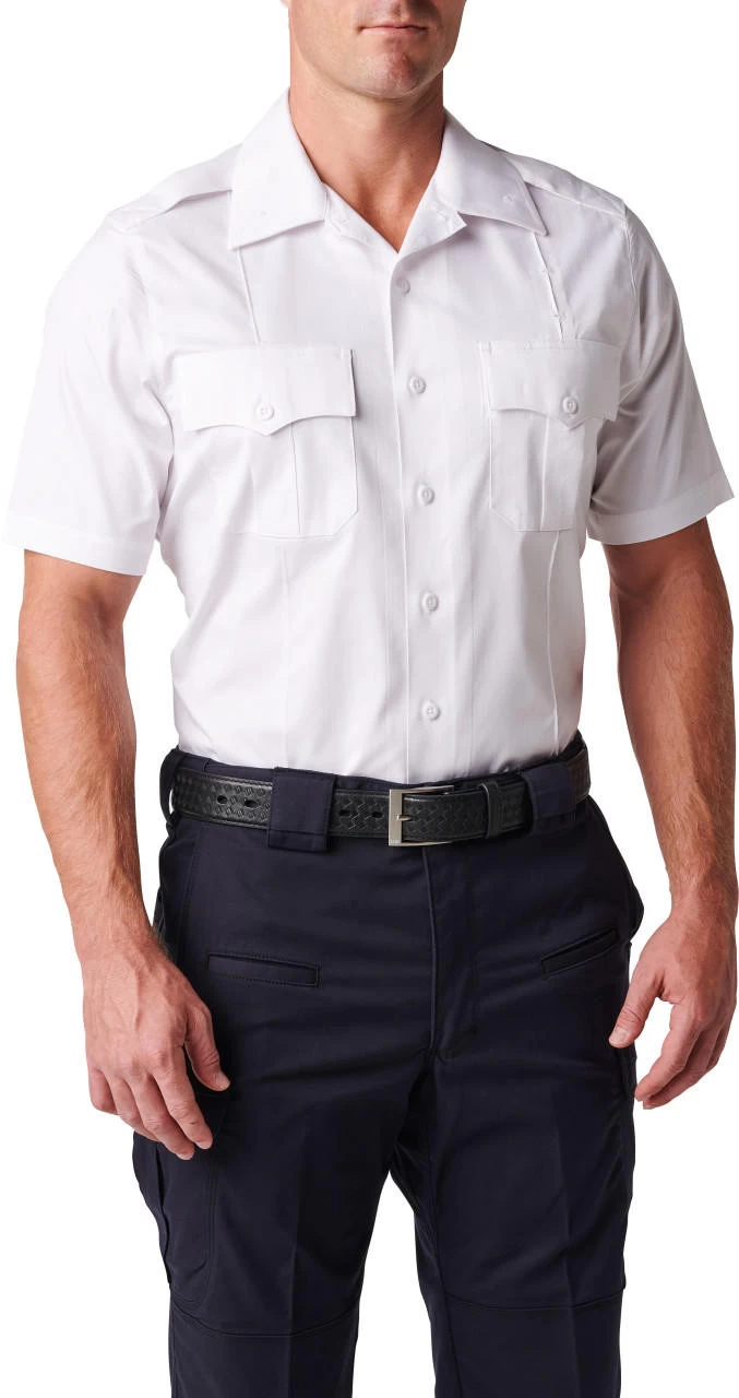 The 5.11 Tactical Men’s NYPD Stryke Twill Short Sleeve Uniform Shirt 71401 meets the NYPD Spec for uniform shirts and is made with 5.11’s Patented Flex-Tac mechanical stretch twill fabric for performance, durability and easy movement. Sewn-in military creases, epaulettes and scalloped chest pockets with pen guides. Button-front closure with an NYPD Approved label sewn into the front placket. Embroidery eyelets on left chest and each collar. Poly/cotton Flex-Tac Twill is finished with Teflon for stain and soil-resistance.