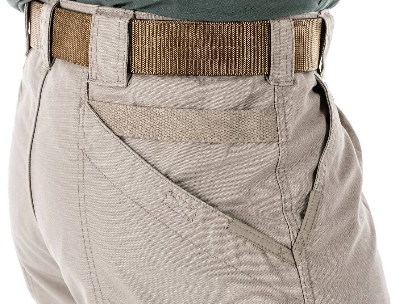 Front pockets are strong and roomy; inverted pleats on the cargo pockets remain flat until needed for a neat, professional appearance. A narrow thigh pocket accommodates a magazine, cell phone, or utility knife. The extra deep rear slash pockets are easily accessed and hold extended mags, a baton or a 15″ flashlight. You can also use the utility strap to secure a flashlight or store your ear protection at the range.