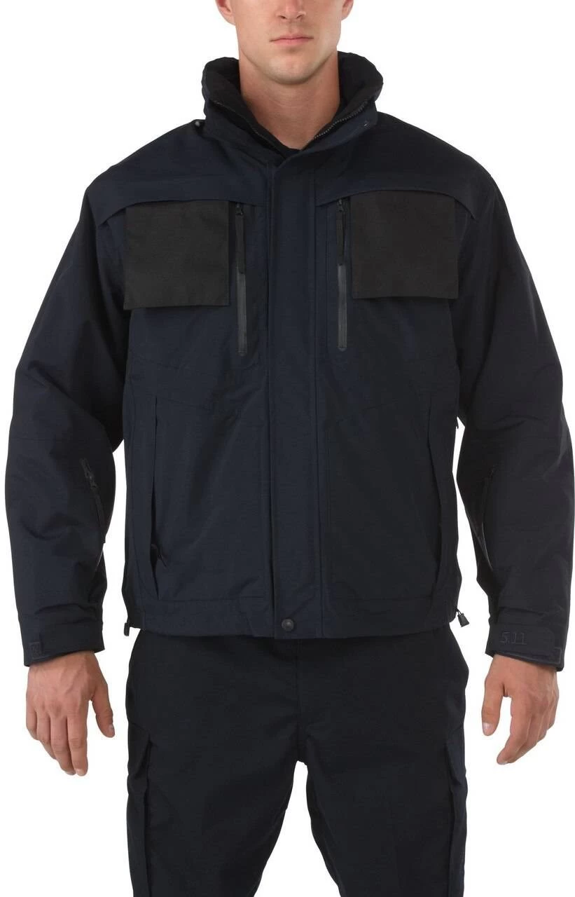 The 5.11 Tactical Valiant Duty Jacket was built on 5.11’s traditional 5-in-1 jacket and features a modular design with zip off sleeves and a vest option, allowing you to adapt your duty wear to the current environment. Not you can get to your duty belt or holster much faster with 5.11’s patented quick-zip side access system. The Valiant Duty Jacket is fully waterproof and seam-sealed throughout to protect against inclement weather. This jacket comes with a waterproof hood that can be stored in the collar or be removed. Two pull out ID panels on the front and one large panel on the back can be embellished. Two vertical chest storage pockets along with two forearm pockets provide easy access and additional storage. This duty jacket also comes with hidden mic loops on the left and right chest. The Valiant Jacket has large hand warmer pockets with zipper closures and storm flaps that are backup belt compatible. There is a badge tab and epaulette kit included. The inner liner has two vertical storage pockets with either zipper or hook & loop closures for added security. The jacket has a removable softshell liner that can be worn with the outershell or on its own as a stand alone jacket. The softshell liner has zip off sleeves allowing the jacket to convert into a vest. The softshell liner also comes with large hand warmer pockets with zipper closures.