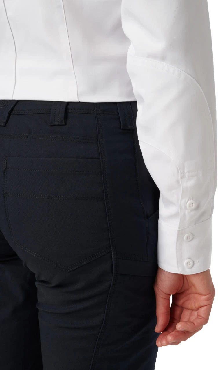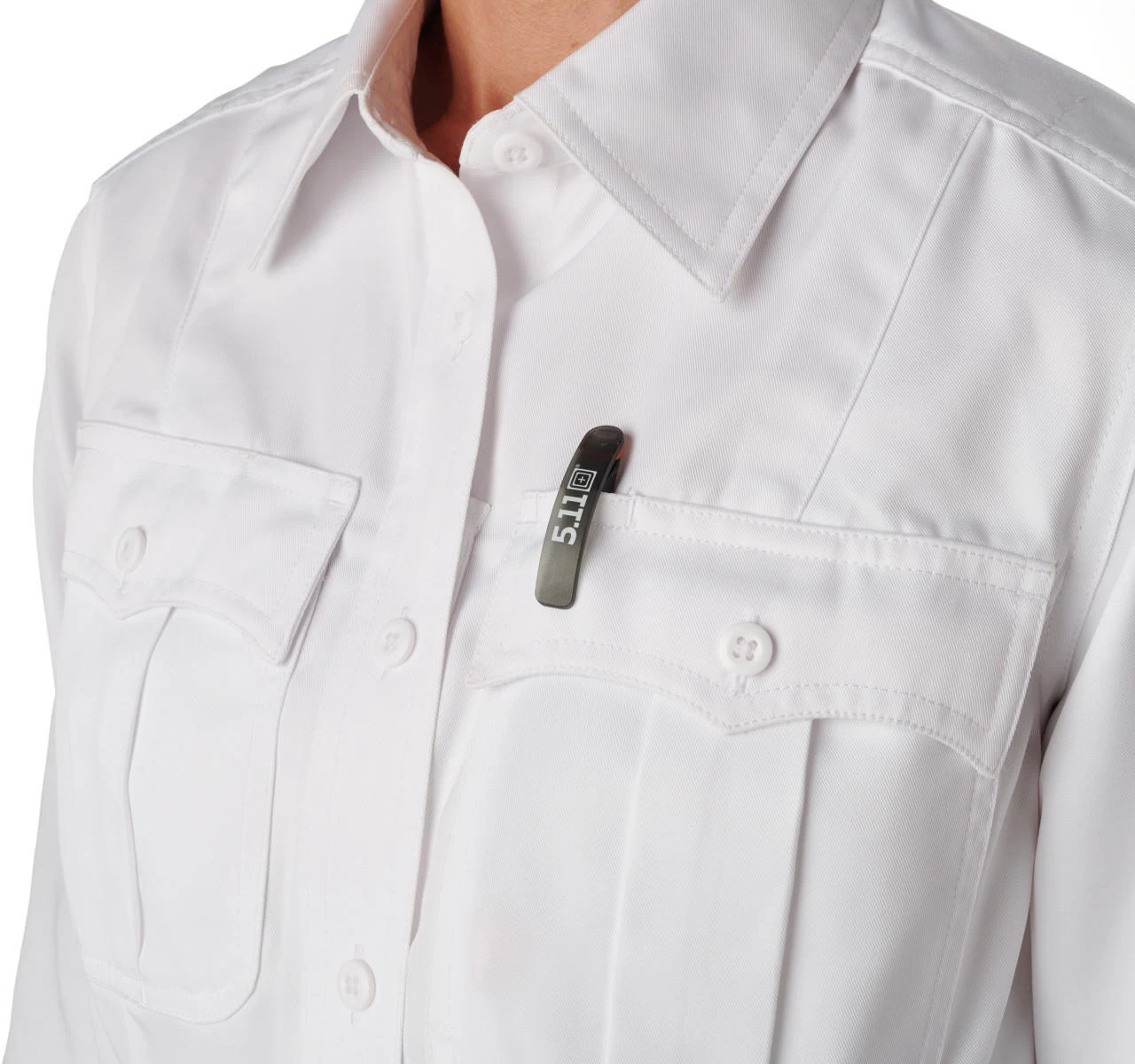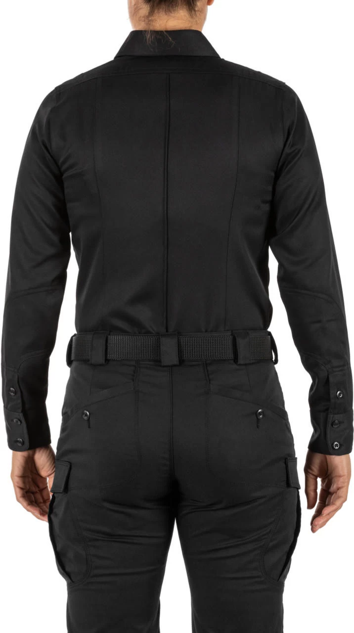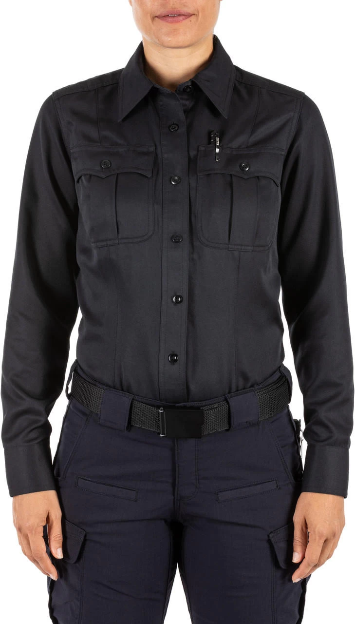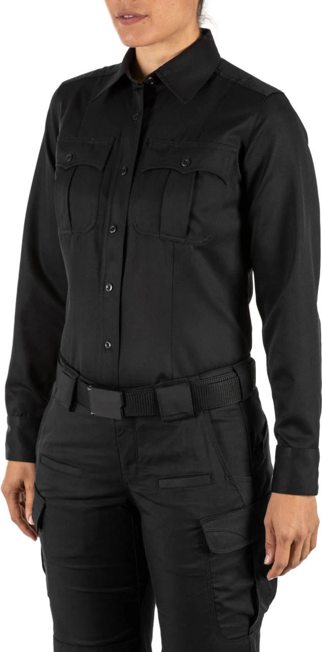 The 5.11 Tactical Women’s Class A Fast-Tac Twill Long Sleeve Uniform Shirt 62396 is a lightweight, water-resistant Class A Fast-Tac Twill, equipped for duty, with mic loop openings on the side seams, dual chest pockets with pen guides, and a center front zip closure. It also comes with everything you need to do your job: Epaulettes, badge tab, camera/radio loop, and a name badge support strip. The stitched creases help you maintain a professional look, no matter what your time at the station or on the street entails.