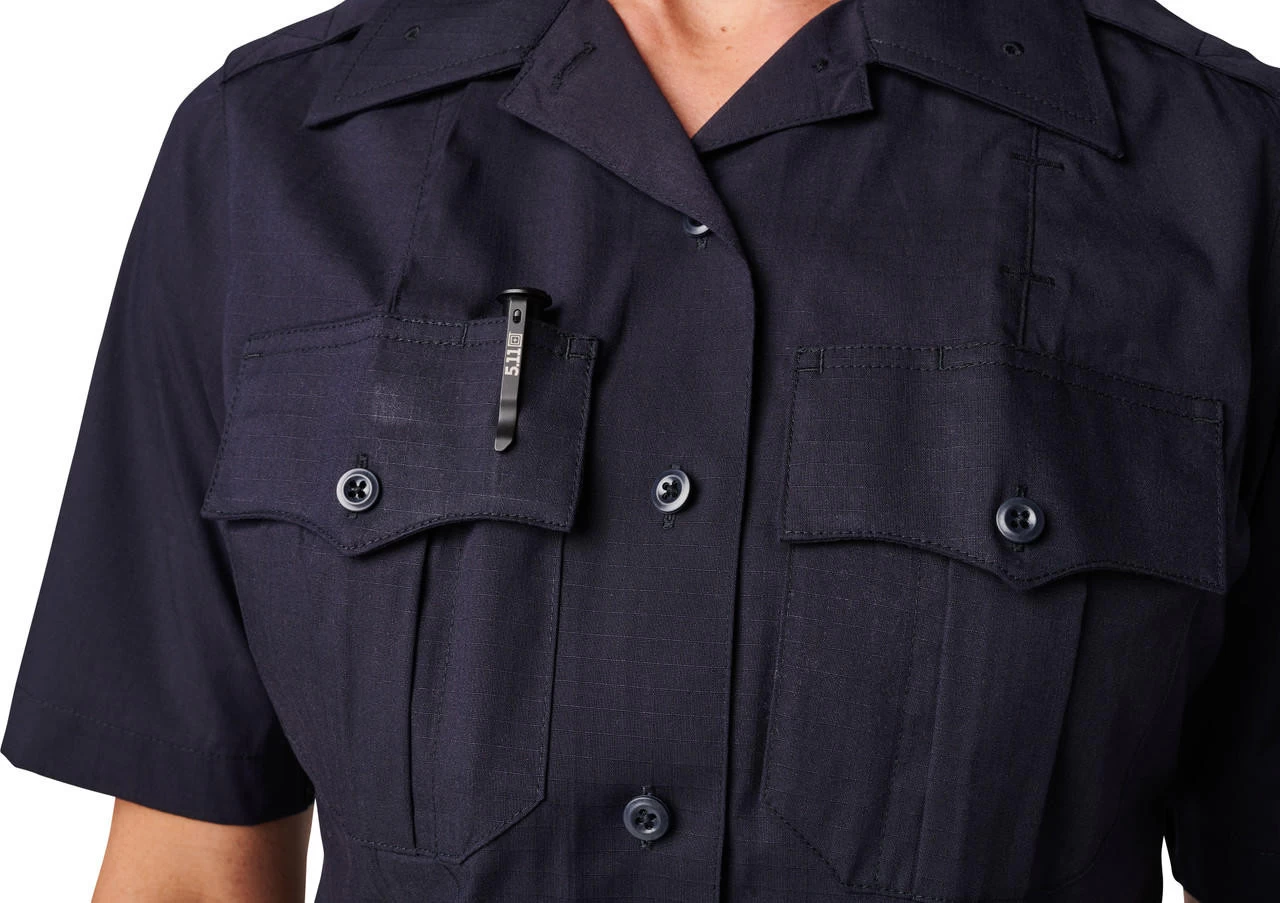 The 5.11 Tactical Women’s NYPD Stryke RipStop Short Sleeve Uniform Shirt 61335 meets the NYPD Spec for uniform shirts and is made with 5.11’s Patented Flex-Tac mechanical stretch ripstop fabric for performance, durability and easy movement. Sewn-in military creases, epaulettes and scalloped chest pockets with pen guides. Button-front closure with an NYPD Approved label sewn into the front placket. Poly/cotton Flex-Tac Ripstop is finished with Teflon for stain and soil-resistance.
