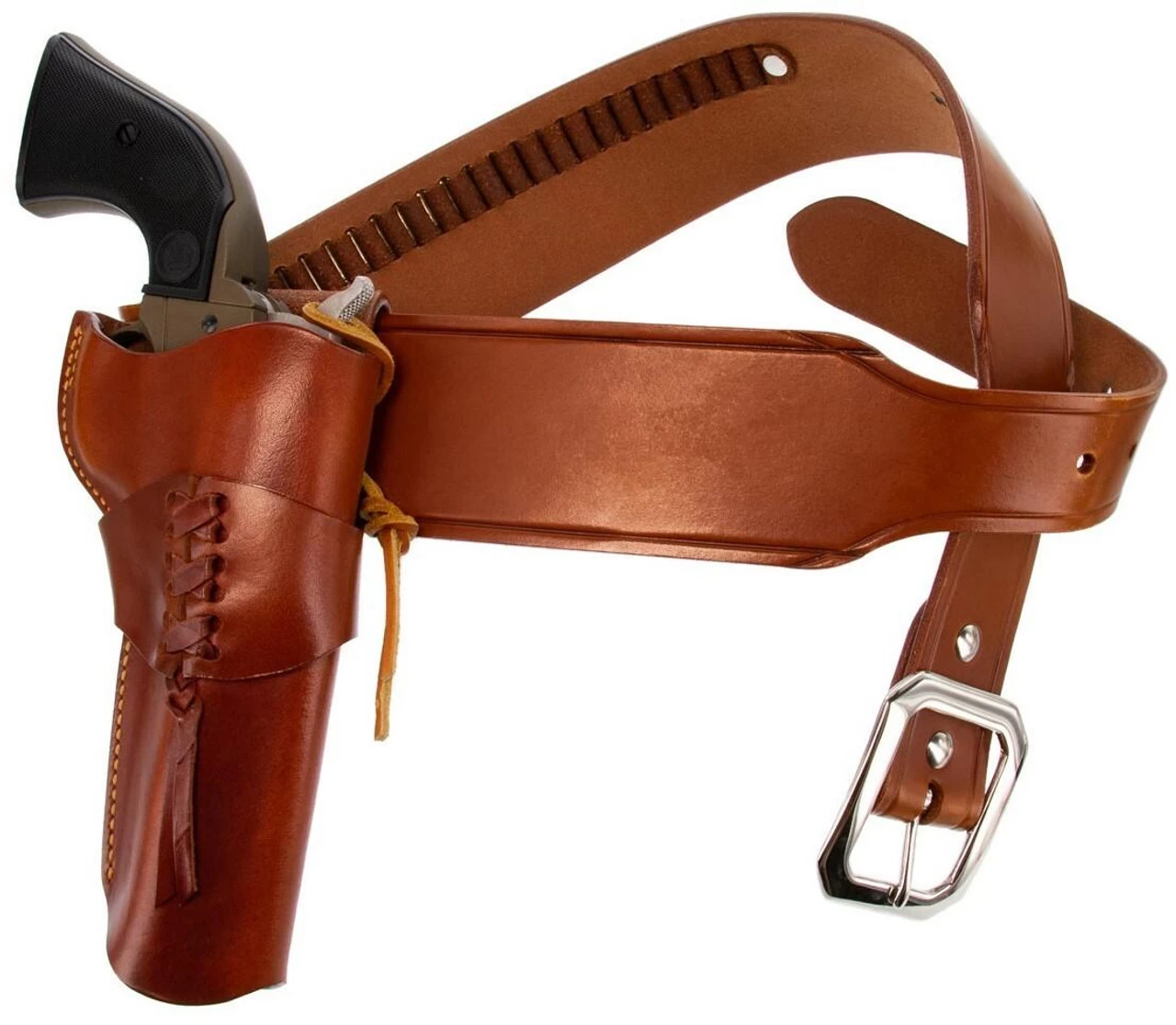 The Galco Ruger Wrangler .22LR Cartridge Belt is designed to fit single action revolvers featuring tan steerhide and a high-riding design with open top and hammer thong retention. The matching leather cartridge belt carries spare rounds in loops. 2.5″ wide and tapering toward the brass buckle, it’s available in a wide range of sizes from 34″ to 50″ to fit most shooters. Perfect for carrying your revolver hunting, camping, or that most American of pastimes, plinking.