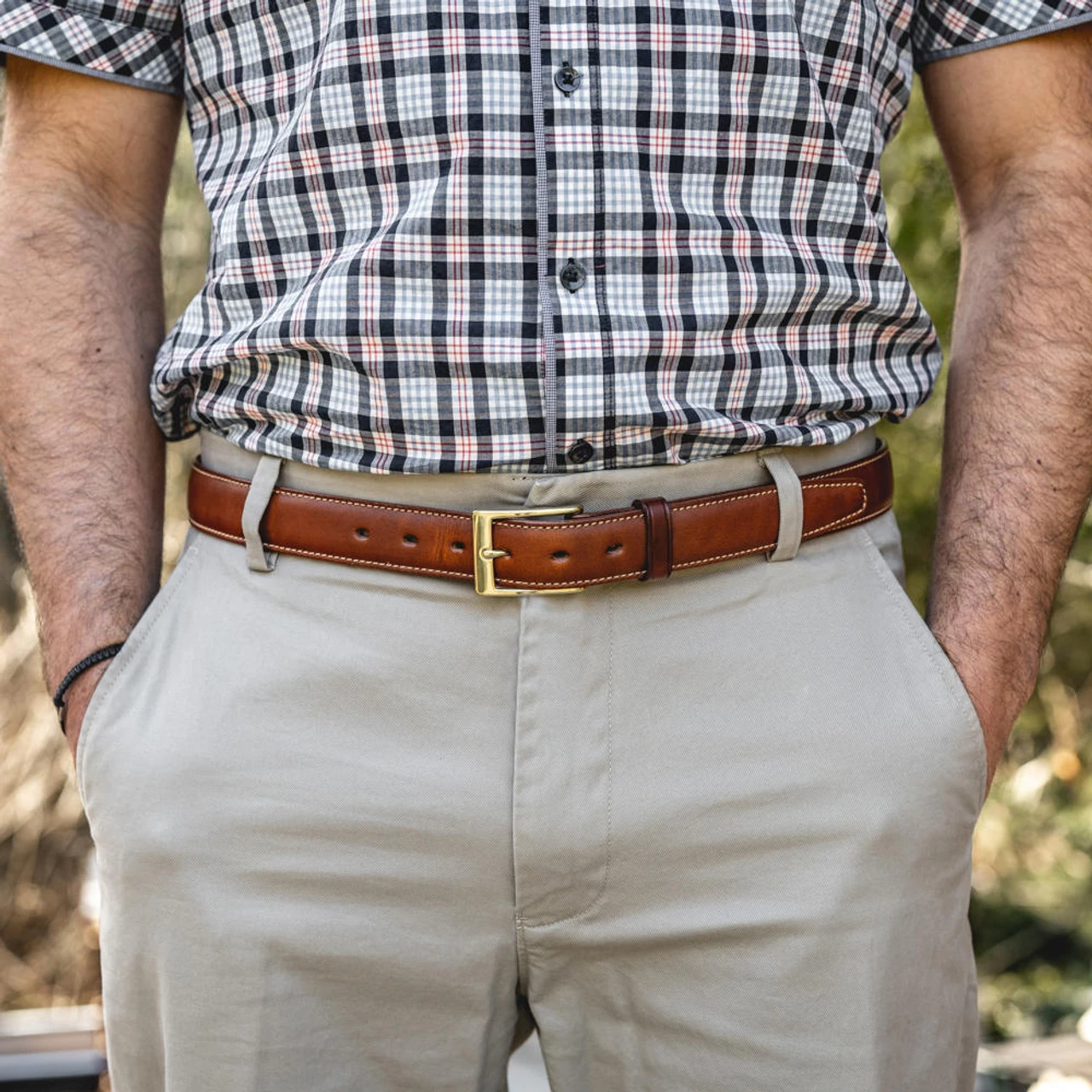 The SB1 Dress Holster Belt is a 1 1/4″ wide reinforced dress belt designed to support the weight of a handgun with double-thickness premium steerhide that is available in tan with a solid brass buckle and black or havana brown with a nickel-plated solid brass buckle.