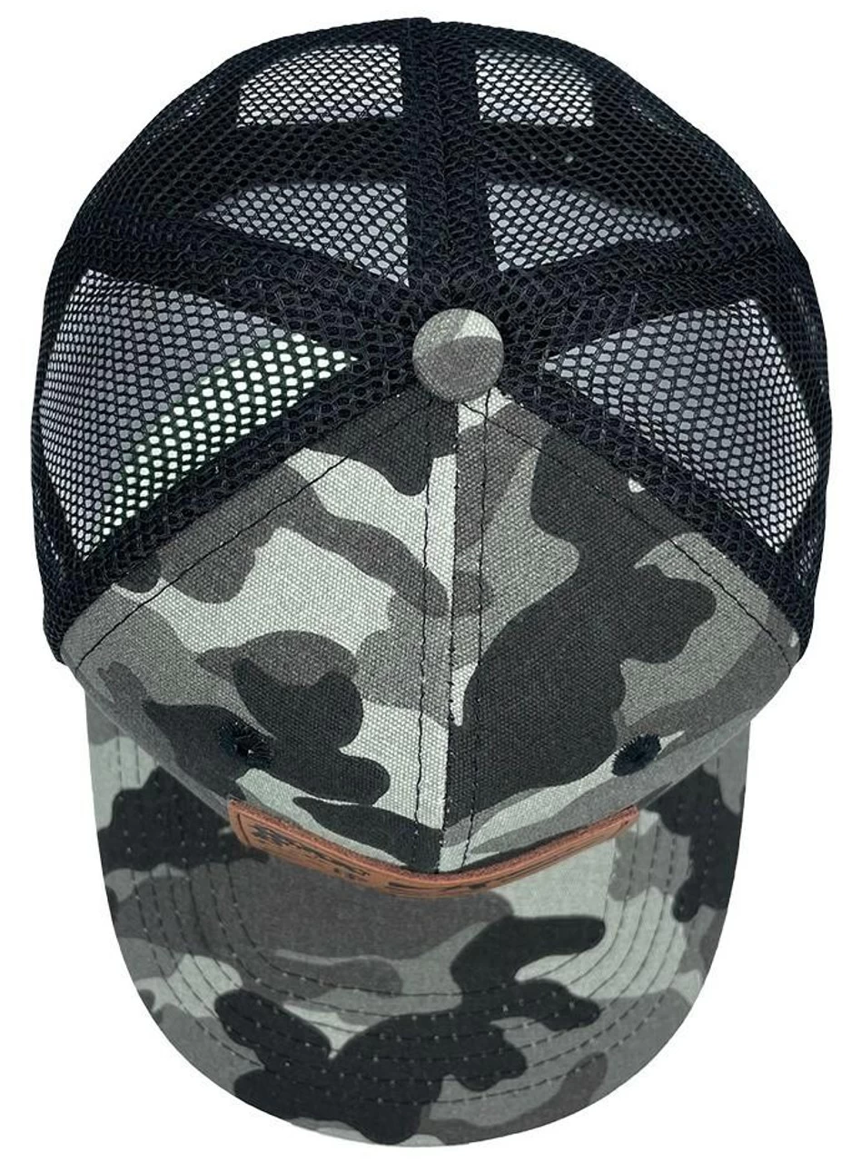 The LAPG Men’s Camo Gun Flag Hat has a camo brim and front panels, black mesh paneling, a leather gun flag patch on the front, and an adjustable snapback closure to fit a range of head sizes. The patch is embroidered with a single needle stitch for a clean look.