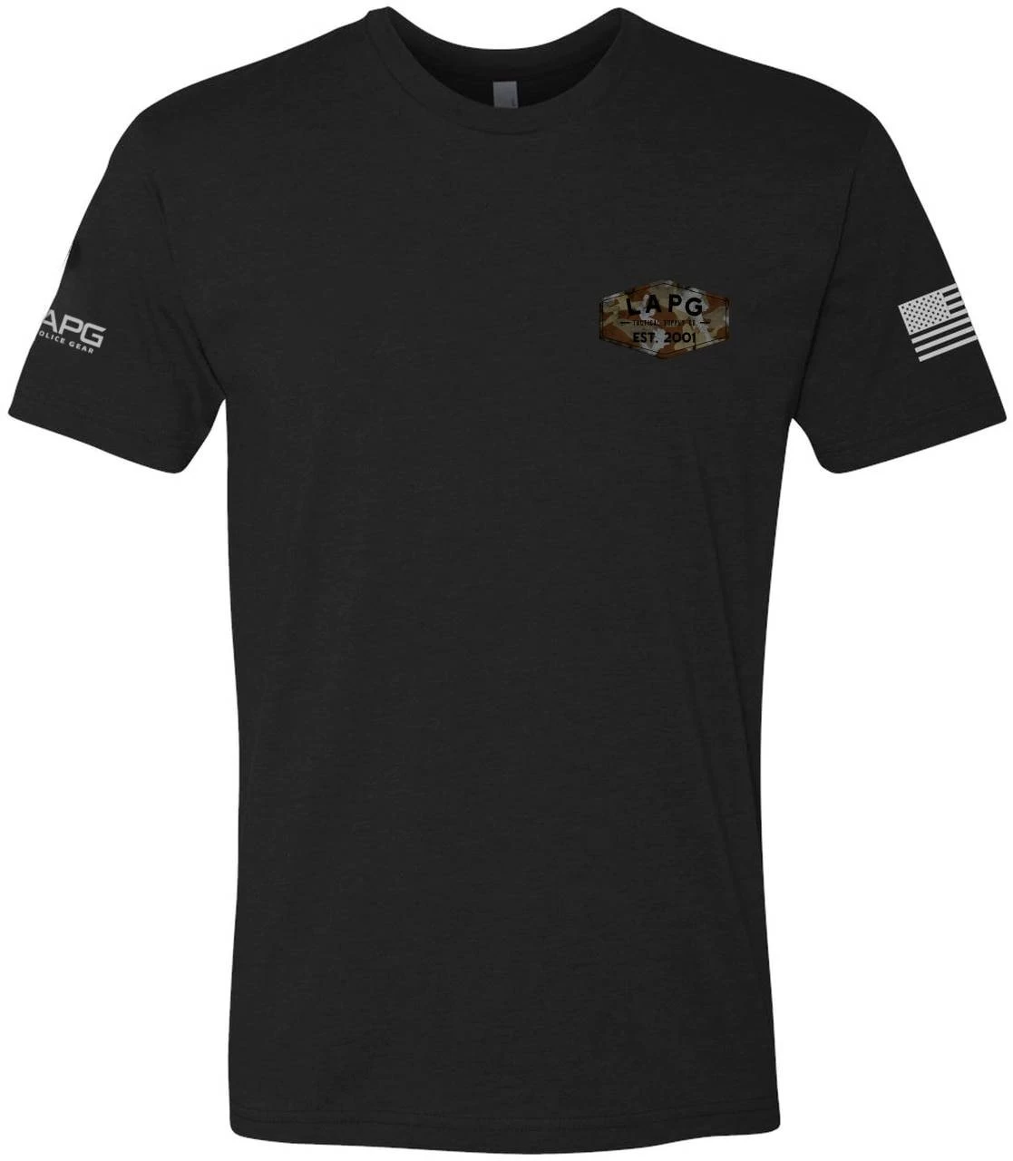The LAPG Camo Tac Supply T-Shirt features out logo in a camo pattern on the back of the shirt and is made from 100% cotton, making it comfortable and perfect for wearing out anywhere!