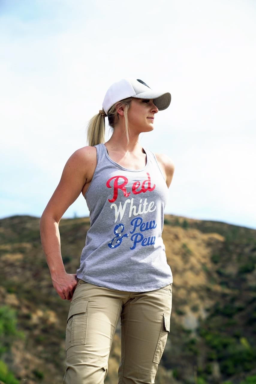 The LA Police Gear Red White & Pew Pew shirt features a colorful front graphic perfect for the range!