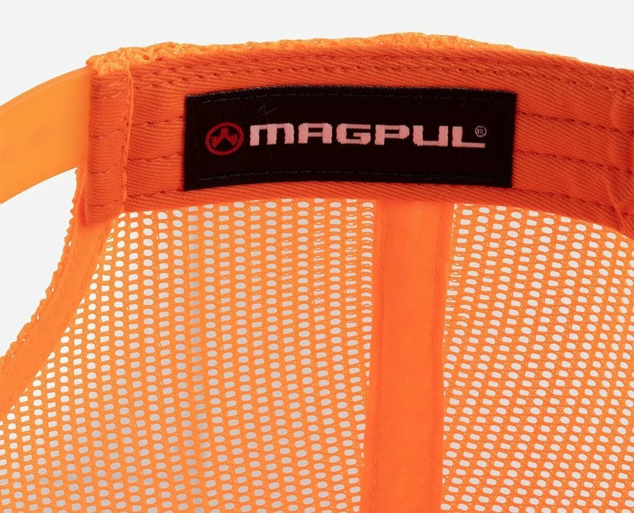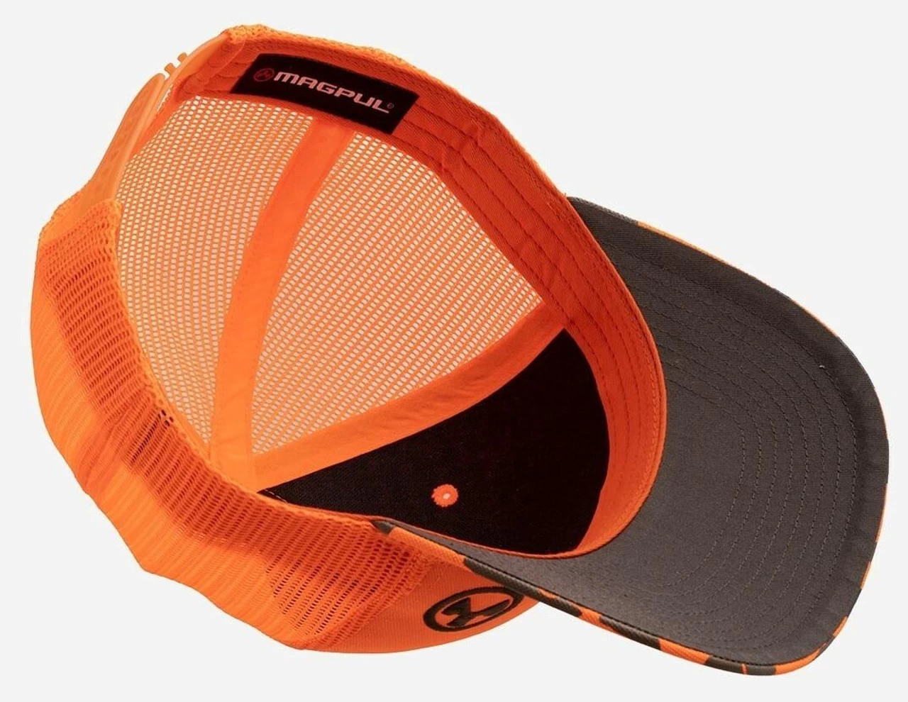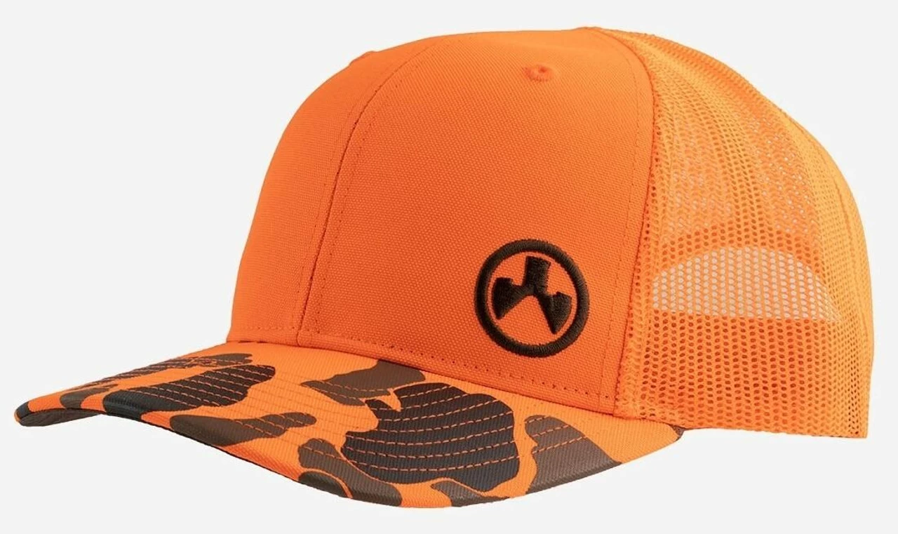 The Magpul Icon Blaze Orange Trucker. If you can’t be all camo, how about orange camo? One size fits most with its adjustable snapback design, hat sizes 7 – 7 3/4.