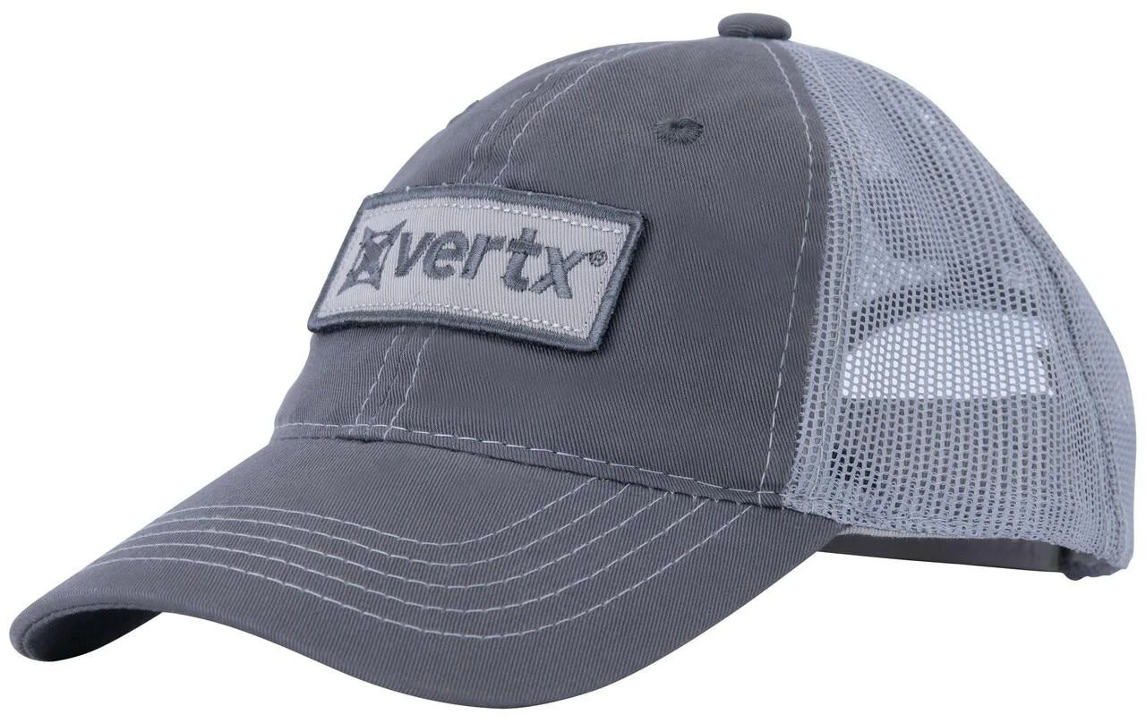 The VertX Grey Logo Hat features a retro trucker hat silhouette with mesh side and back panels, a hook and loop sizing strap for an adjustable fit, and is finished with embroidered logo patch on the front, logo embroidery on sizing strap and embroider ton-on-ton American flag on the back.